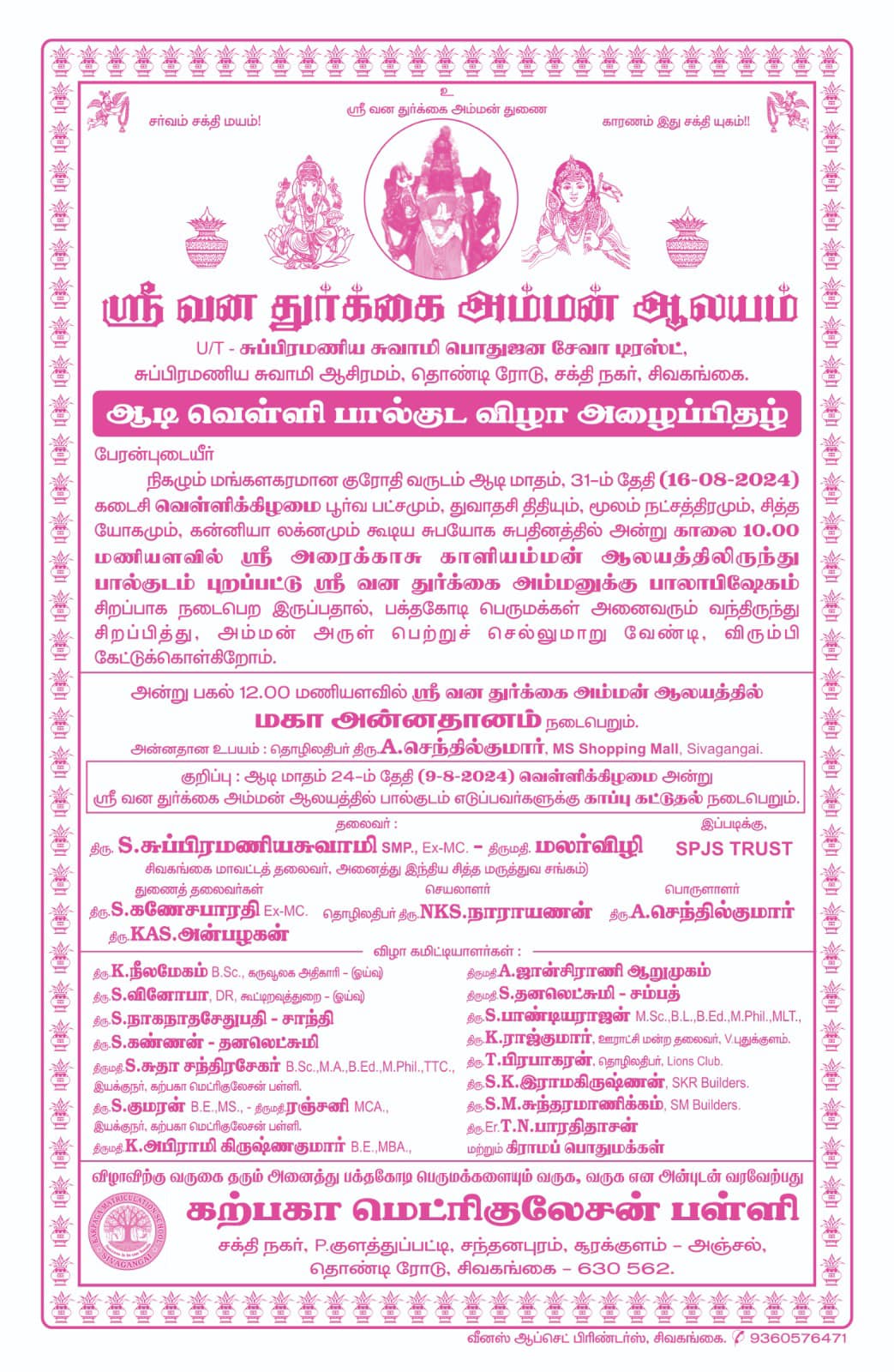 பால்குட விழா ஆண்டுதோறும் ஆடி மாதம் பால்குட விழா வெகு விமரிசையாக கொண்டாடப்படுகிறது. இந்நாளில் விரதமிருந்து பக்தர்கள் அனைவரும் பெரும் திரளாக கூடி தங்கள் வேண்டுதல் நிறைவேற பால்குடம் சுமந்து வந்து அம்மனை வேண்டி தரிசிப்பர்.