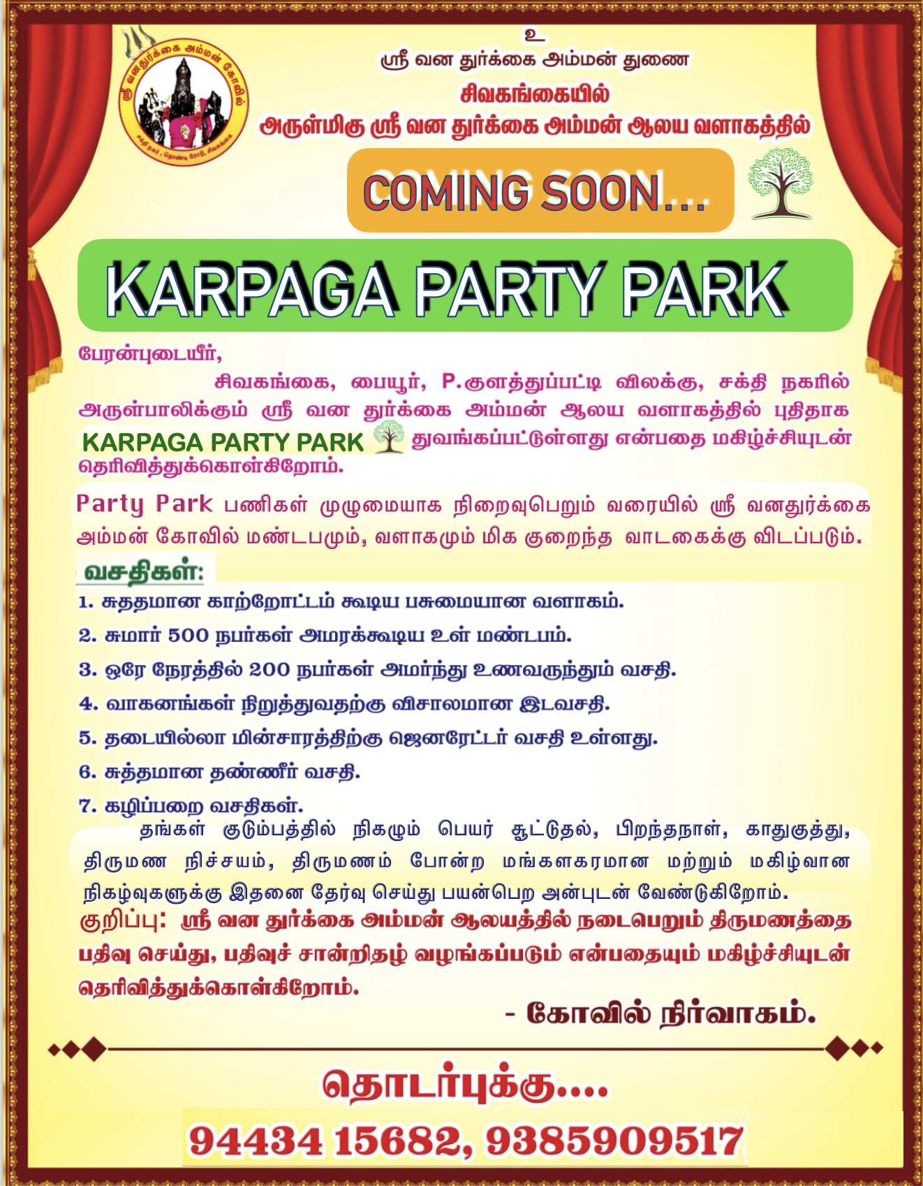 சிவகங்கை அருகே சக்திநகரில் அமைந்துள்ள அருள்மிகு வனதுர்க்கை அம்மன் கோவில்வளாகத்தில் புதிதாக Karpaga Party Park தொடங்கப்பட உள்ளது என்பதை மகிழ்வுடன் தெரிவித்துக் கொள்கிறோம்.